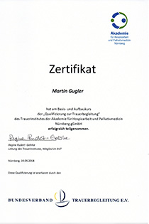Mein Name ist Martin Gugler und ich bin zertifizierter Trauerbegleiter. Meine Ausbildung erhielt ich an der Akademie für Hospizarbeit und Palliativmedizin Nürnberg. Ich bin vom „Bundesverband für Trauerbegleitung“ anerkannt und zertifiziert.